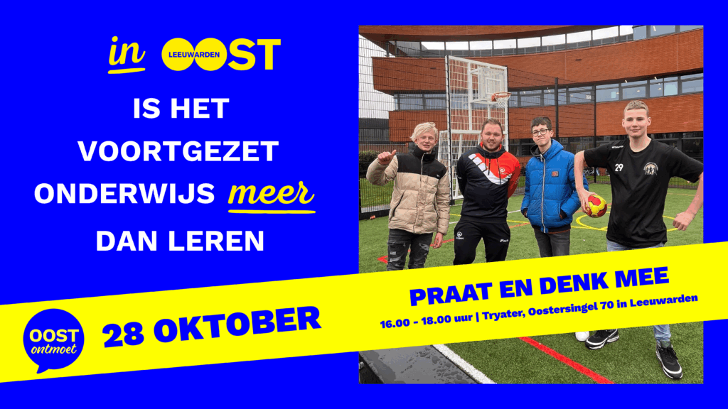 De volgende Oost Ontmoet is op dinsdag 28 oktober, van 16.00 tot 18.00 uur (inloop vanaf 15.30 uur), met aansluitend soep en broodjes tot uiterlijk 18.30 uur. Een ontmoeting voor partners, professionals, vrijwilligers en andere betrokkenen bij het programma Leeuwarden Oost.